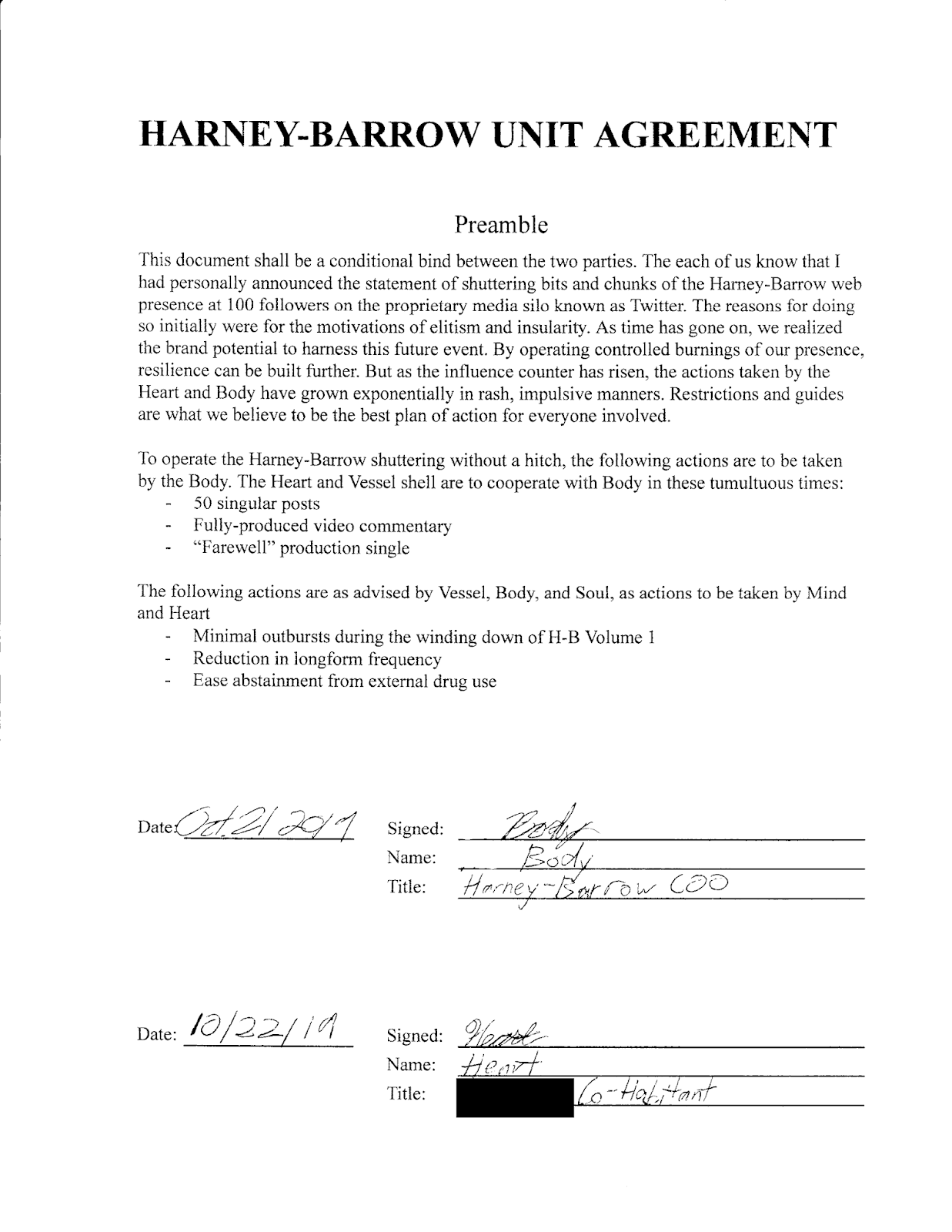 He’ll be done with this. An group agreement has been settled and written down. As a group, the H-B unit sends our token apologies. The agreement has been signed by key members of the unit, but it should take another day until it’s digitized. Struggling with the copier, sorry.